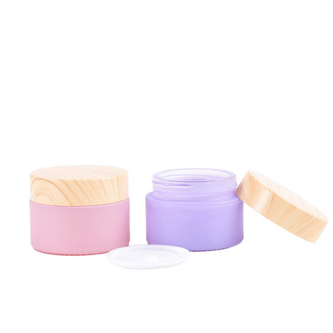 ขวดแก้วเปล่าสำหรับเครื่องสำอางพร้อมฝาไม้ขนาด15กรัม30กรัม50กรัม100กรัมสีเขียวสีม่วงน้ำเงิน